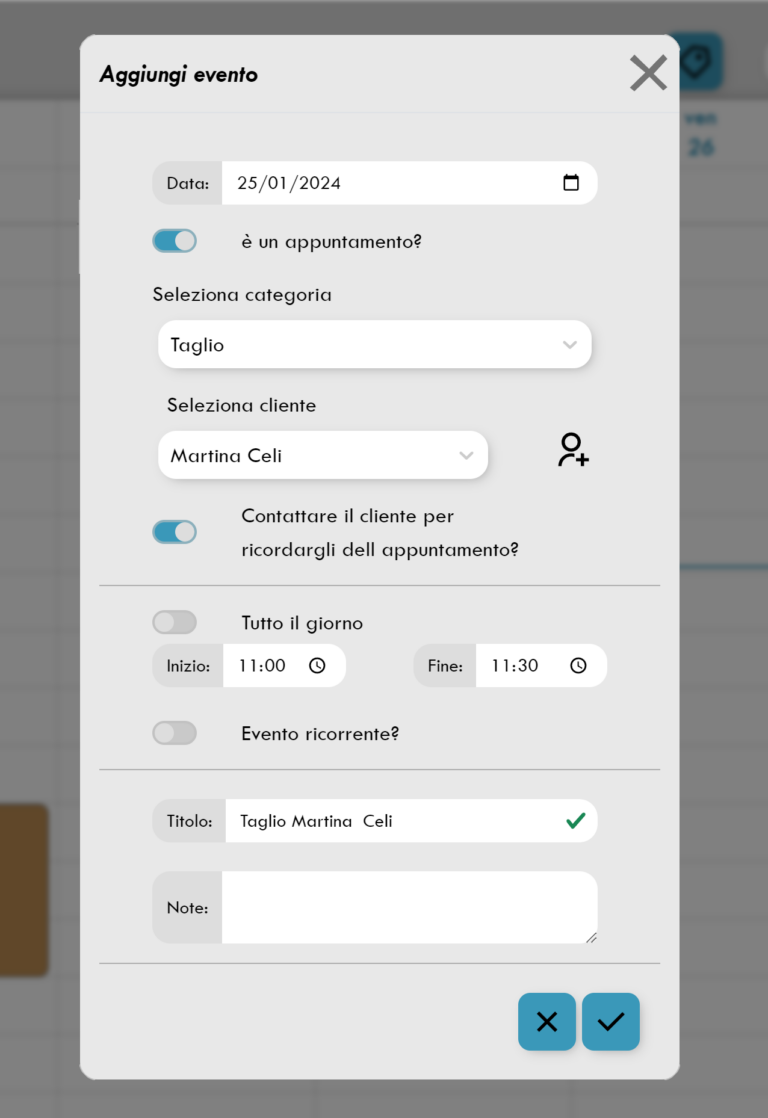 Wählen Sie das Datum und die Uhrzeit des Termins, ordnen Sie ihn einer bestimmten Kategorie zu, um die Organisation zu erleichtern, und ordnen Sie den beteiligten Kunden zu.
